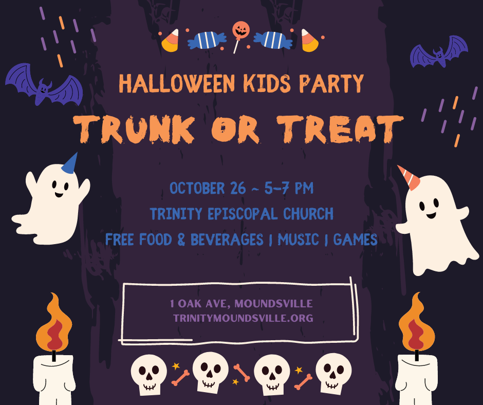 Trunk or Treat October 6, 2024 Trinity Episcopal Church News Trinity will host a Trunk or Treat on October 26 from 5-7pm. Art designed by Trinity Member – Makaela Will Food, music, candy, and a costume contest. If you’d like to reserve a spot for your organization or business to participate please contact Hilary at 304-639-5631.
